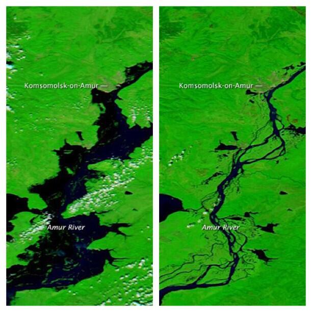 На фото со спутника NASA Амур: слева – 8.09.2013, справа – 17.08.2012.